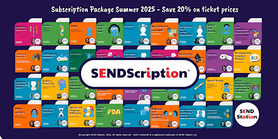 SENDScription® is designed for those who want even better value training. It offers a saving of around 20% on standard ticket prices* from SEND Station. This termly subscription package provides the best value for purchasing SEND Station training sessions.
